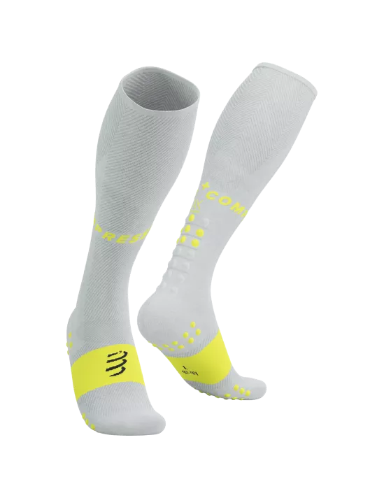 La nouvelle génération de Full Socks Oxygen hisse le soutien musculaire et la ventilation à un niveau supérieur : vous pouvez compter sur un allié redoutable pour les courses rapides dans les contextes les plus chauds. Ces chaussettes de compression pour la course à pied et les sports d`endurance sont légères comme une plume, offrant une sensation de seconde peau inégalée et un confort exceptional grâce à un tissu en maillage ultra-doux. Pour notre chaussette la plus légère de la gamme Compressport, l`aération et la respirabilité sont primordiales : les bandes de ventilation entrelacées en zigzag partent de la base du mollet, puis leur hauteur augmente progressivement autour du muscle, pour une dilatation et une respiration naturelle lors des efforts intenses. Cette ventilation graduée assure une thermorégulation de très haut niveau pour vous accompagner lors de vos plus grandes courses. Les fibres incroyablement fines conservent toutes les propriétés et avantages de la compression, pour un soutien et une protection maximale du pied et des mollets, tout en limitant les chocs et les vibrations dans les muscles et les tendons. L`oxygénation des muscles est améliorée jusqu`à 10 %, ce qui retarde l`apparition de la fatigue et augmente les performances. Les 3D.Dots soigneusement placés autour du pied offrent une meilleure adhérence dans la chaussure et remontent jusqu`au tendon d`Achille pour stimuler la circulation sanguine et absorber les chocs. La structure et le volume des Dots sont réduits par rapport à d`autres modèles de chaussettes pour obtenir une légèreté générale, mais leur efficacité est conservée. Enfin, nos nouveaux logos tricotés durables garantissent que la signature de Compressport restera en place dans les conditions les plus difficiles - tout comme vous. Que vous soyez un marathonien ou un coureur de fond, ne faites aucun compromis sur le confort et les performances avec ces chaussettes de compression ultralégères et rafraîchissantes !