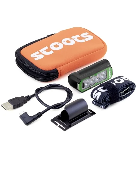 Livrée avec une pochette de rangement, une batterie easyLock 18, un câble de recharge, un support en alu easyLock 18 et une sangle frontale.