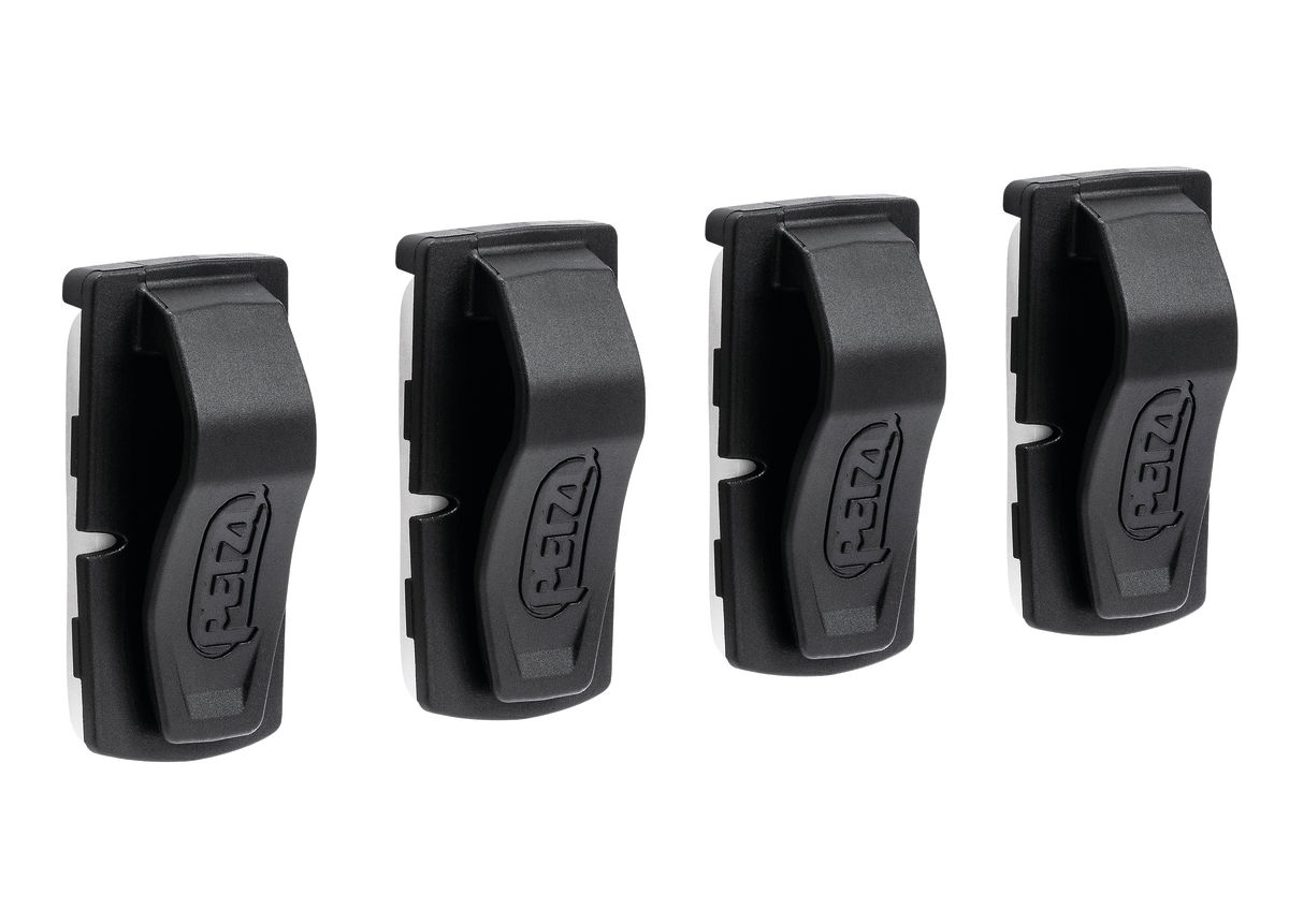 Quatre clips adhésifs permettant de fixer une lampe frontale Petzl sur les casques ne possédant pas de crochet